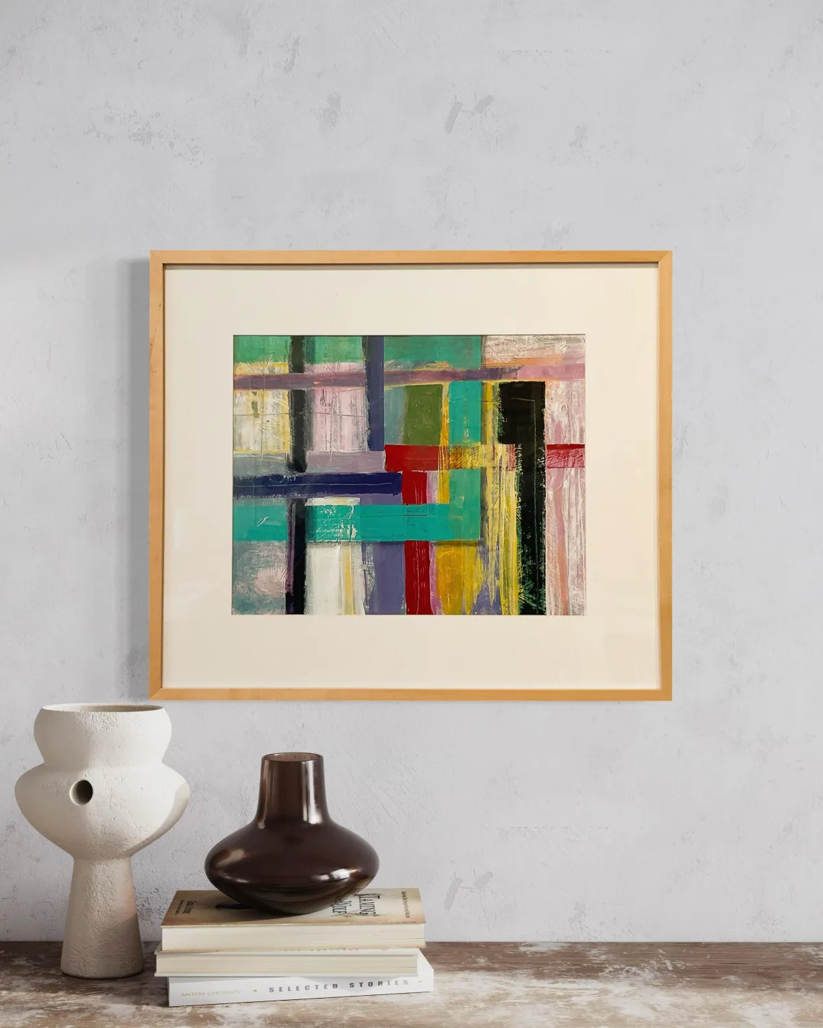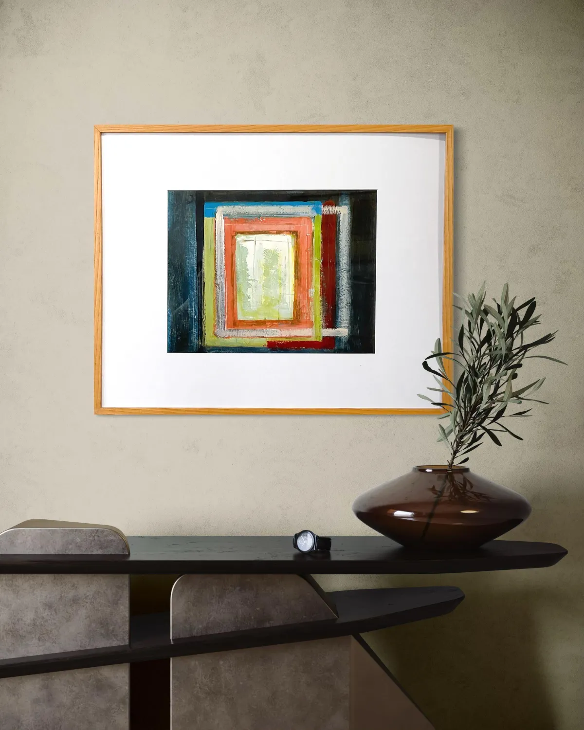 This painting is now in a natural hardwood frame.